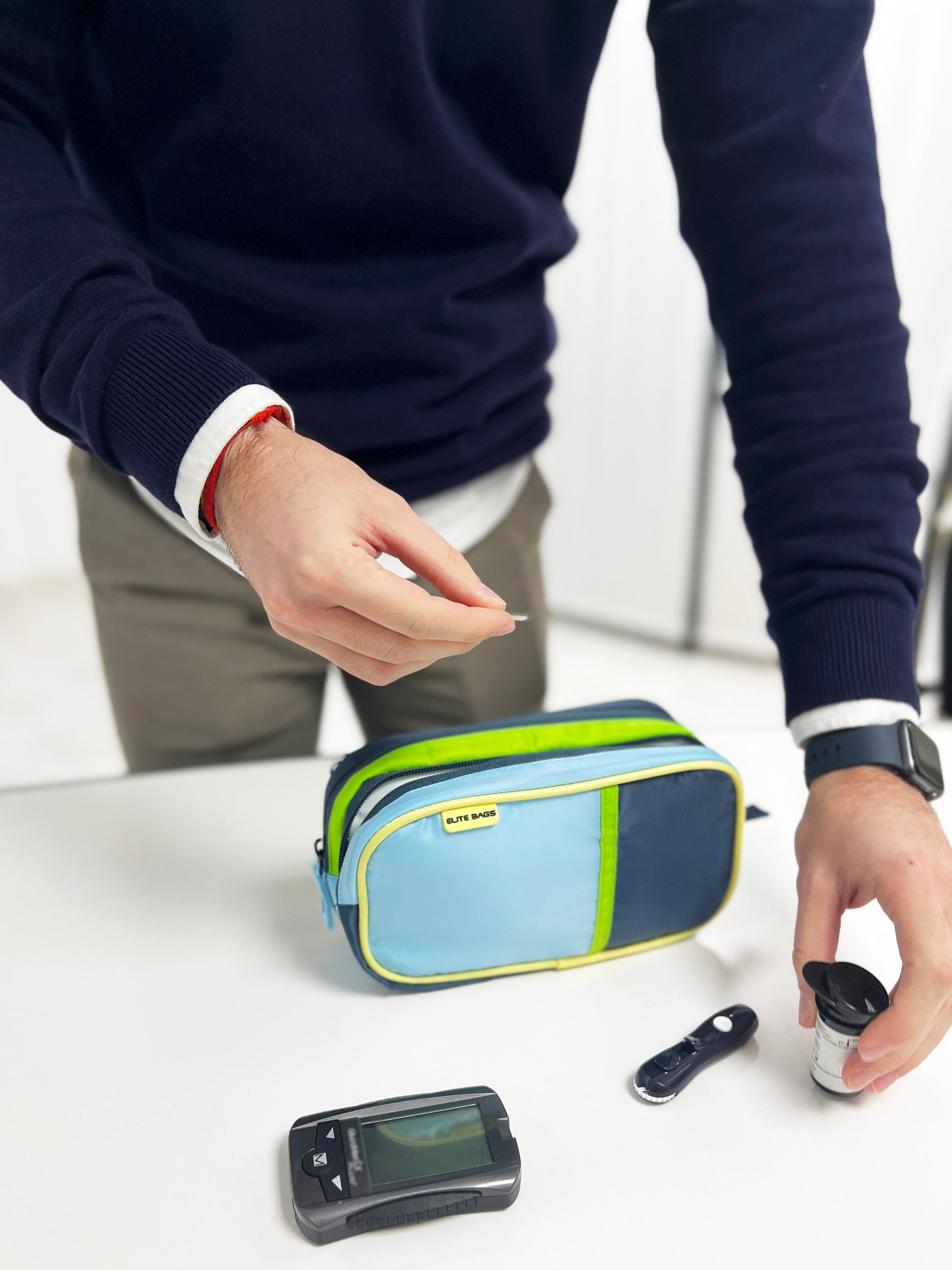 - Front pocket to hold your meter and testing equipment, test strips and extra needles.