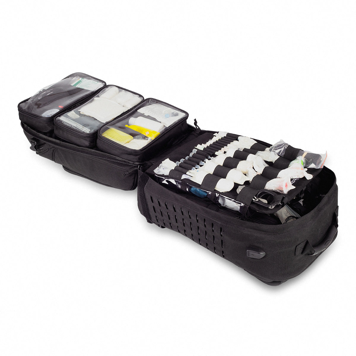 The pinnacle of feedback driven design, this robust and comfortable backpack includes all the features of the PARAMED’S, including compartmentalised layout, removable sealed, clear topped pouches, fold out central flap and pullout waterproof cover.